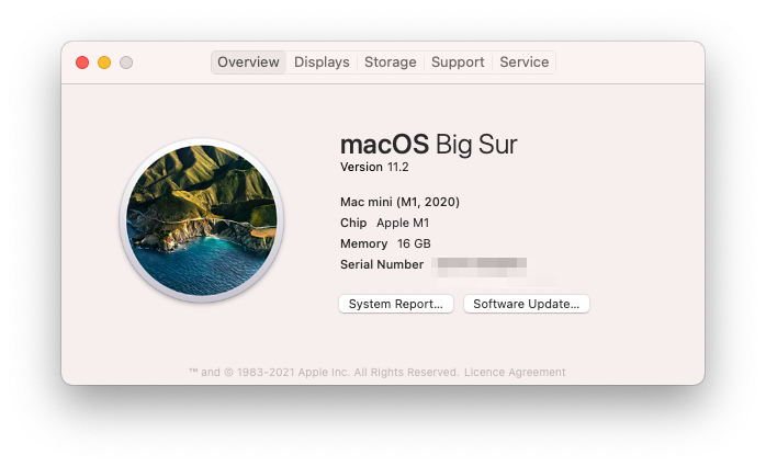This Mac Mini is 16GB (the maximum) and 512GB of storage (the maximum I could justify to myself). Originally it was provided with macOS Big Sur but can be updated to the latest release of macOS. This article was written when macOS Big Sur was the latest release of macOS.