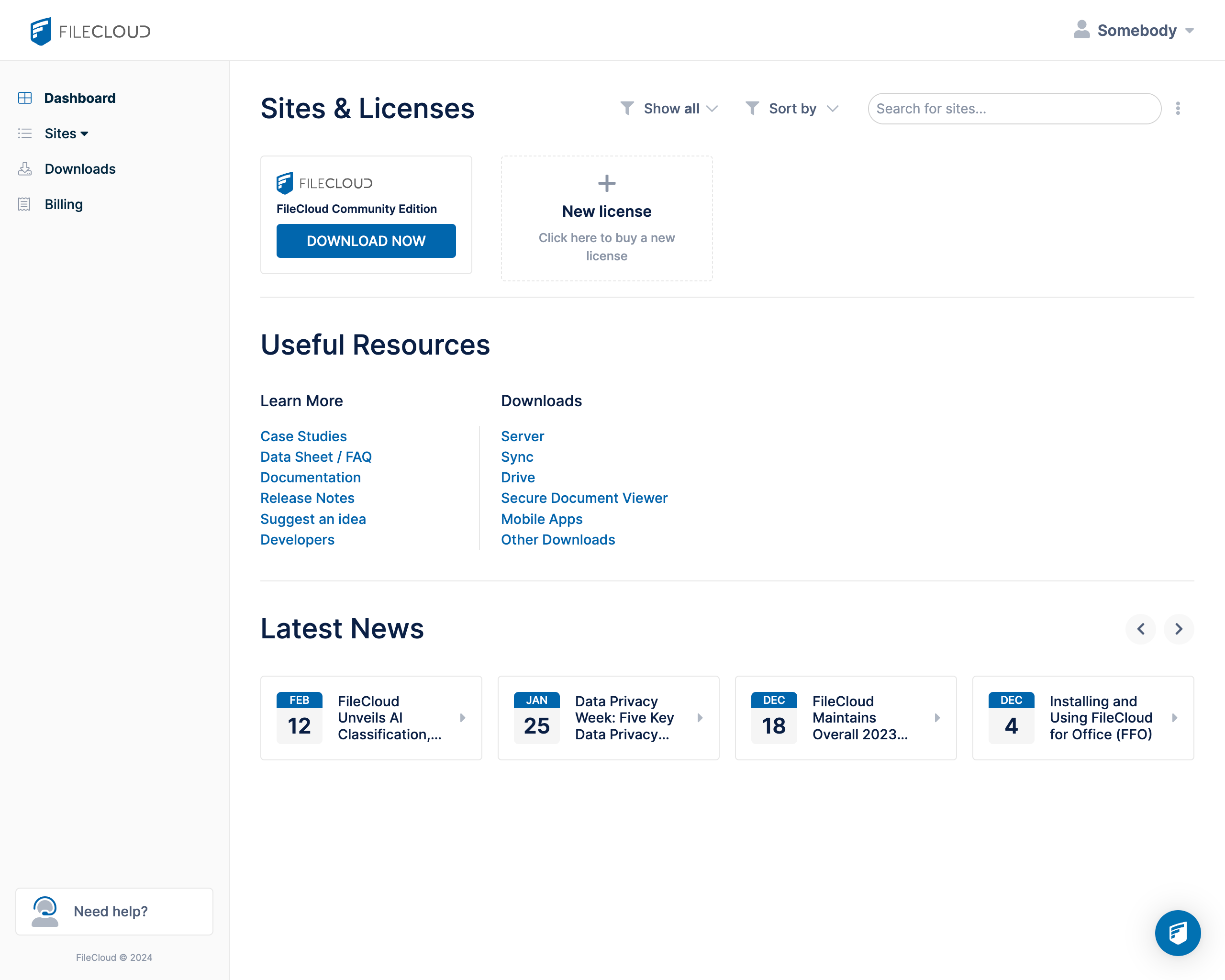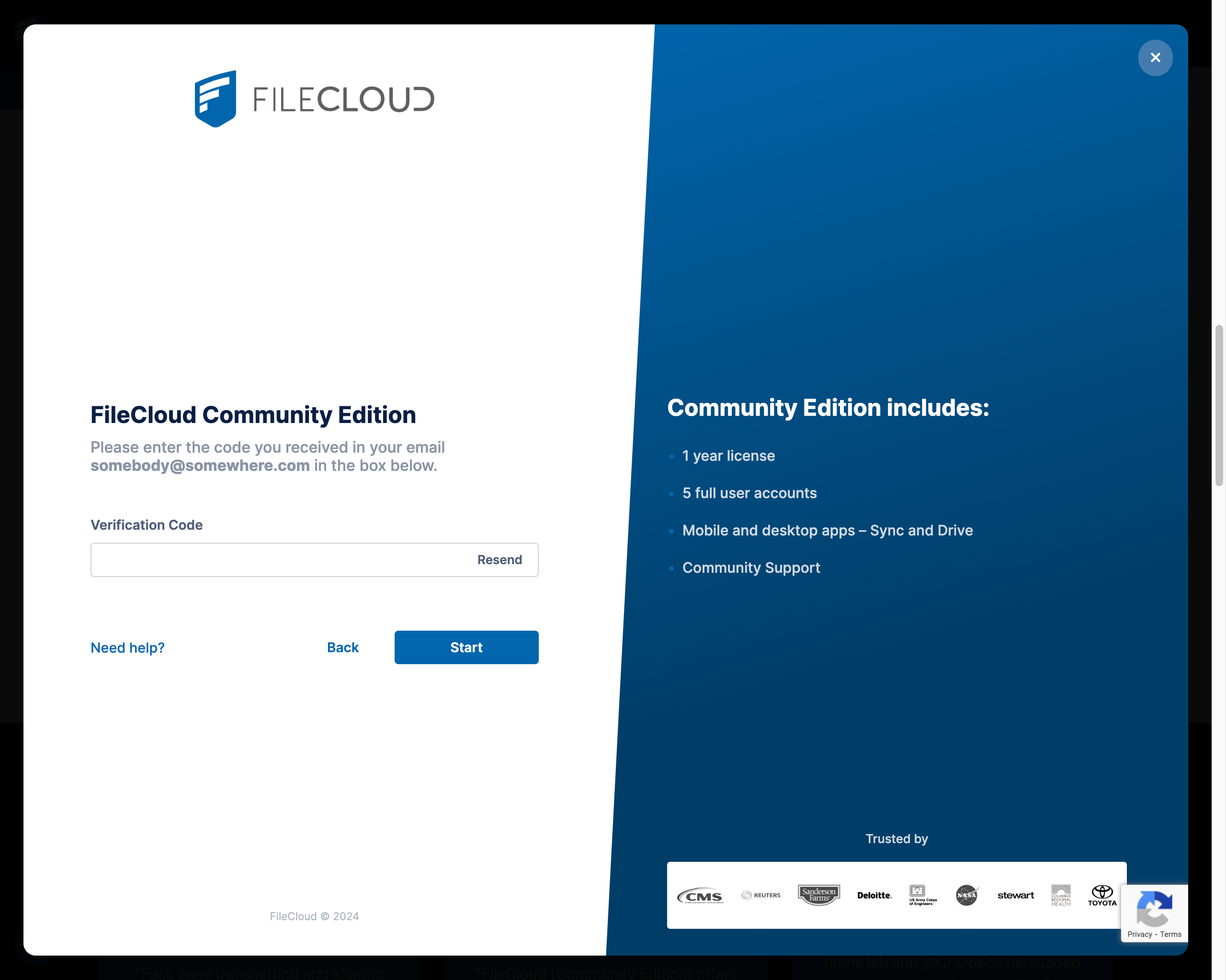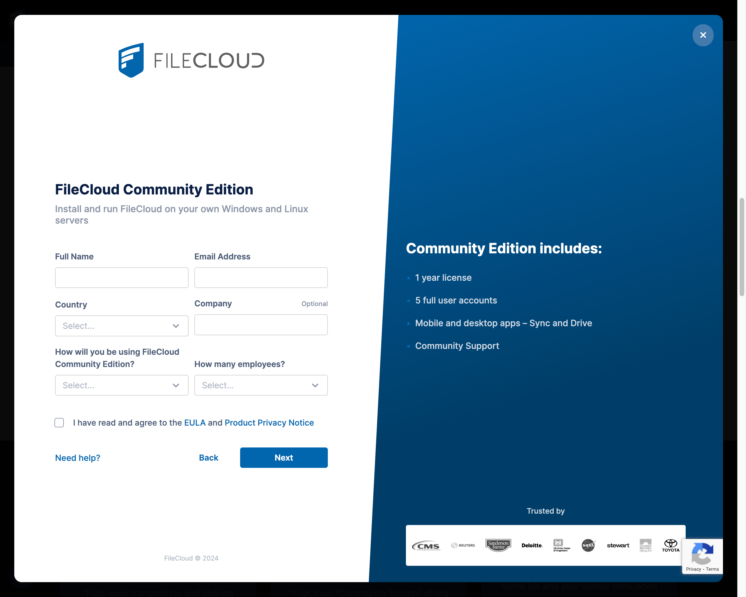 - Register at https://ce.filecloud.com/. You are signing up for a 1 year licence with 5 full user accounts, Mobile and desktop apps – Sync and Drive, and Community Support.